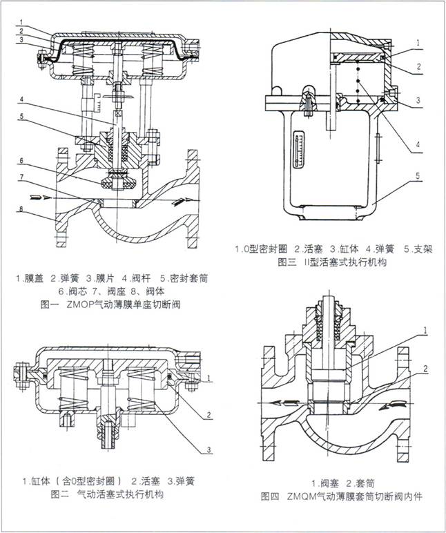 ZXQ(ZSQ)型氣動薄膜(活塞)切斷閥[ZXQ(ZSQ)氣動切斷閥]采用頂導向結構,配用多彈簧執行機構。具有結構緊湊、重量輕、動作靈敏、流體通道呈S流線型、壓降損失小、閥容量大、拆裝方便等優點。